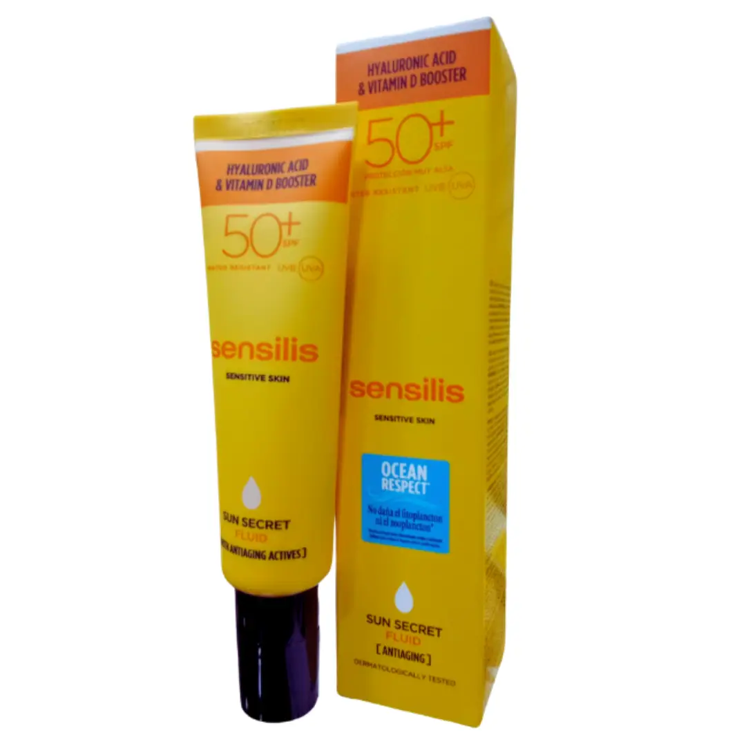 Protect your skin while preventing premature aging with Sensilis Sun Secret Fluid SPF 50+. This lightweight, water-resistant sunscreen is specially formulated for sensitive skin, combining hyaluronic acid for intense hydration and a Vitamin D booster to enhance skin health. Its anti-aging actives defend against UVA/UVB damage while smoothing and firming the skin.