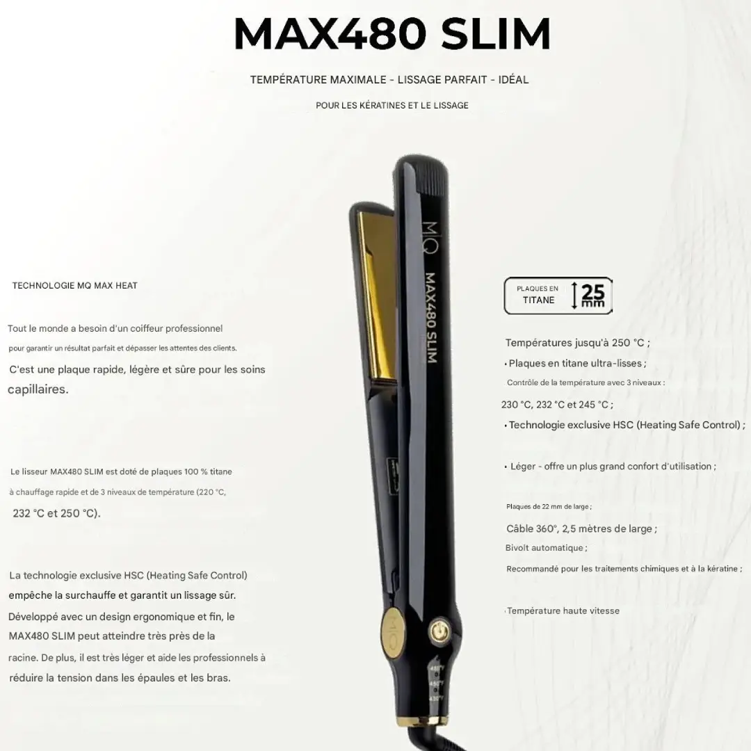 The MQ Professional Max480 Slim Titanium Hair Straightener is designed for fast, sleek, and long-lasting results, making it the perfect tool for keratin treatments and intensive hair straightening. Equipped with 100% ultra-smooth titanium plates (25 mm), it ensures effortless glide, brilliant shine, and smooth results without damaging your hair.
